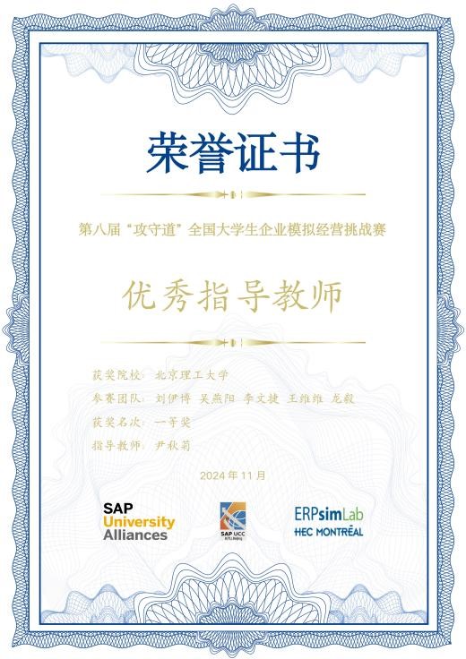 2024年11月,第八届“攻守道”全国大学生企业模拟经营挑战赛在在经历了校内模拟赛、全国初赛和决赛等环节后圆满落下帷幕。北理工两支代表队从众多高校代表队中脱颖而出,分别荣获全国赛“一等奖”和“三等奖”荣誉,尹秋菊老师获得“优秀指导教师”荣誉。其中,24级MBA刘伊博、吴燕阳、李文捷、王维维、本科生龙毅组成的团队,将于2025年6月代表中国赛区参加第十七届全球ERPsim总决赛。